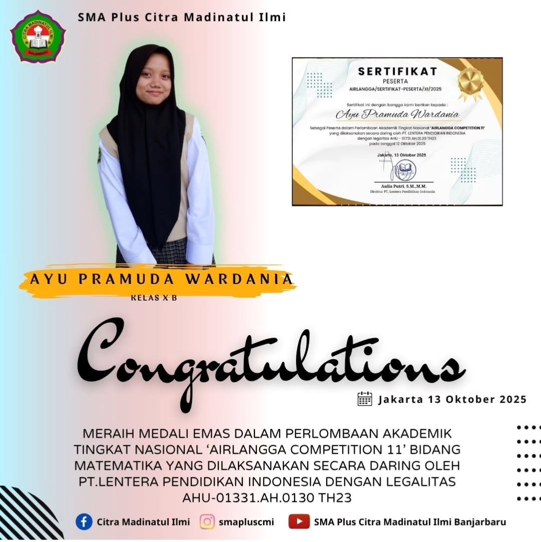 Saya merasa bersyukur menjadi bagian dari keluarga besar SMA Plus Citra Madinatul Ilmi. Nilai-nilai yang diajarkan di sini menjadi dasar kesuksesan saya saat ini. Terima kasih, CMI, karena telah mendidik saya menjadi pribadi yang hebat.