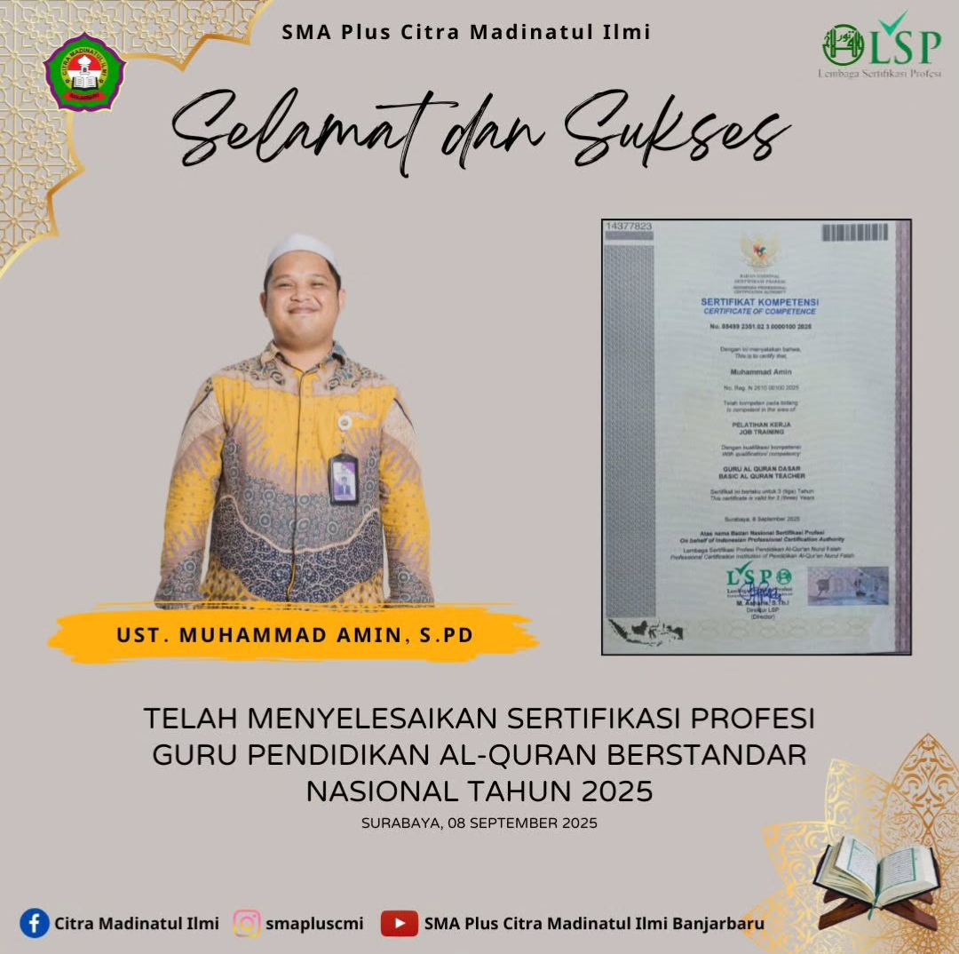 Saya merasa bersyukur menjadi bagian dari keluarga besar SMA Plus Citra Madinatul Ilmi. Nilai-nilai yang diajarkan di sini menjadi dasar kesuksesan saya saat ini. Terima kasih, CMI, karena telah mendidik saya menjadi pribadi yang hebat.